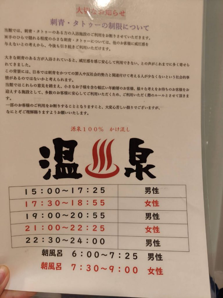 温泉は1つだけあって、そこで男女時間別に入れるシステム。いつでも入れるわけではないため、ちょっと残念。
